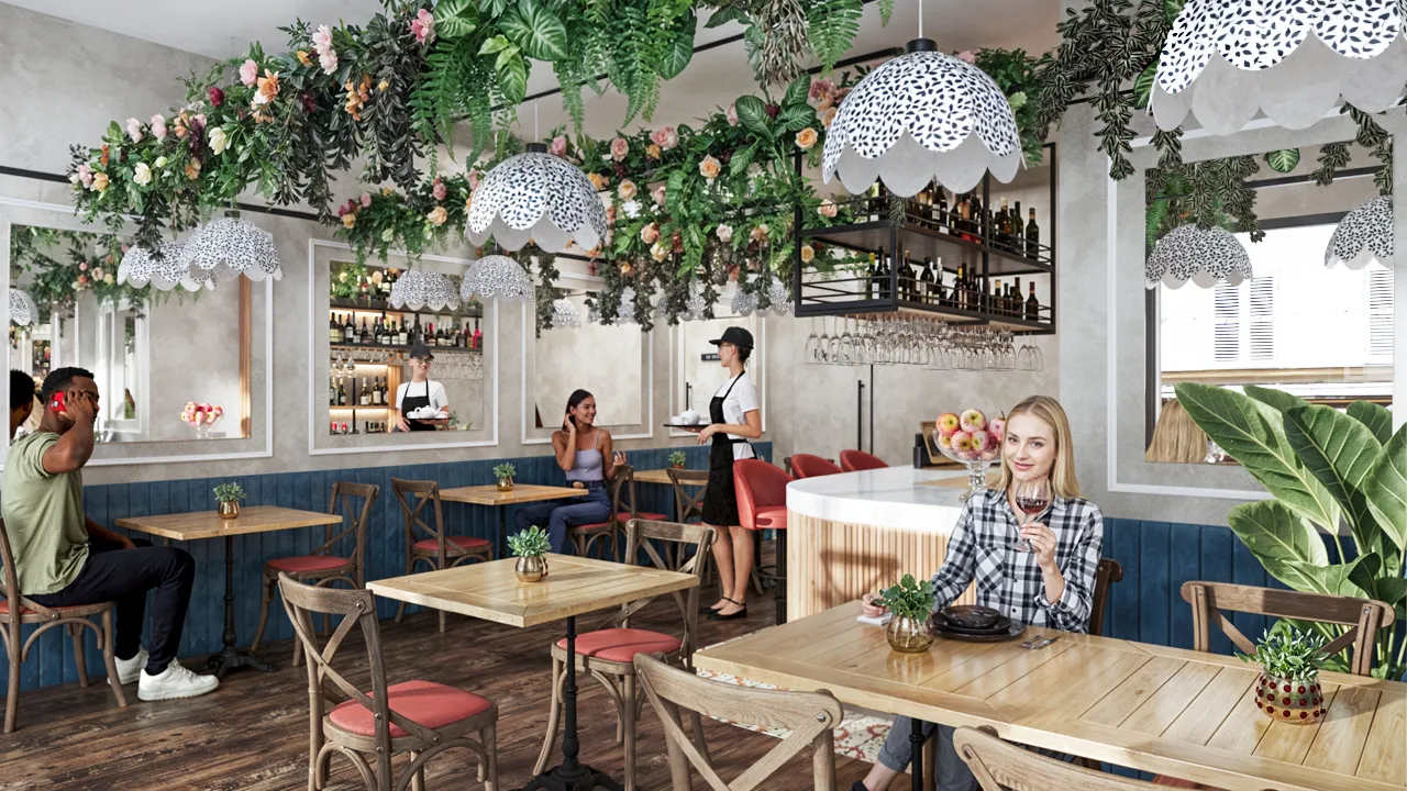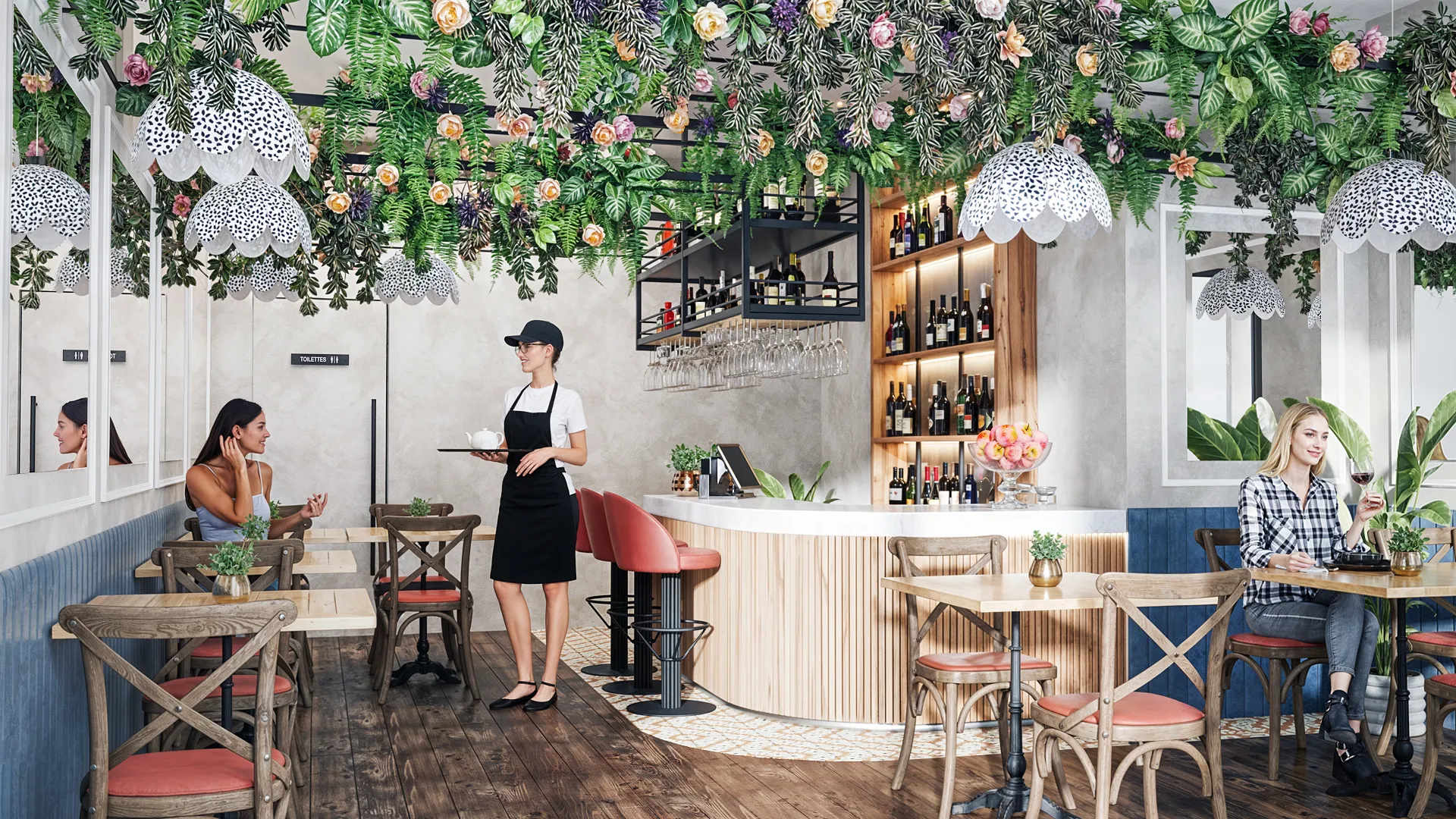 L’aménagement intérieur s’inspire directement de la nature : suspensions florales, murs végétalisés, mobilier en bois et matériaux écologiques. Le restaurant est pensé comme un refuge chaleureux dans un Paris pollué, offrant aux clients une atmosphère apaisante et ressourçante.
