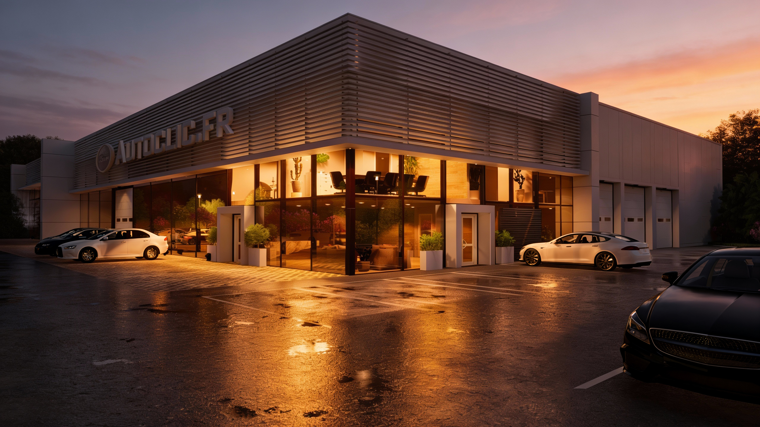Les volumes sont simples tout comme l'aménagement intérieur. Des bureaux occupent partiellement le bâtiment et sont aménagés sur deux niveaux. Leurs surfaces représentent 150m2 environ. Un showroom et un local dédié à la préparation des véhicules occupent 2000m2.