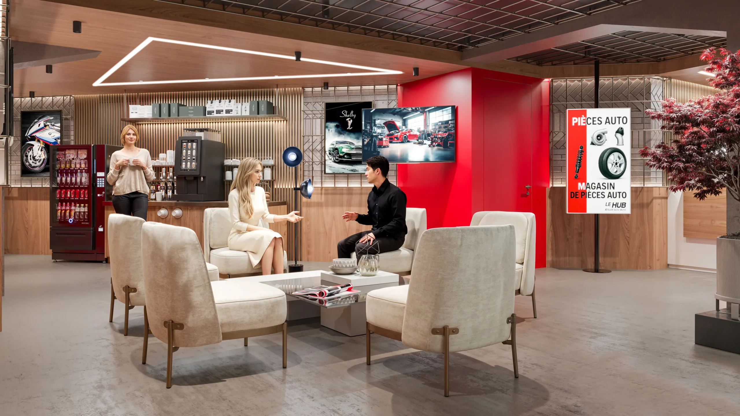 EFi Studio a imaginé des zones dédiées au bien-être et à la détente des clients : salon lounge, espace café, salle d’attente connectée, et vue directe sur les ateliers. L’objectif : transformer le temps d’attente en un moment de plaisir, dans une ambiance raffinée, cohérente avec la promesse d’un service exclusif.